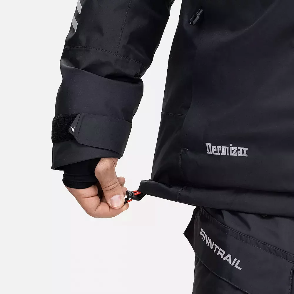 The jacket features a high fleece-lined collar with a chin guard, a two-way adjustable hood with a laminated visor, and an extended back hem with a drawcord for a secure fit. A snow skirt blocks wind and snow from entering, while the sleeve construction eliminates shoulder seams for better mobility. Adjustable outer cuffs with Velcro tabs and warm inner cuffs with microfleece lining and thumbholes keep your hands protected.