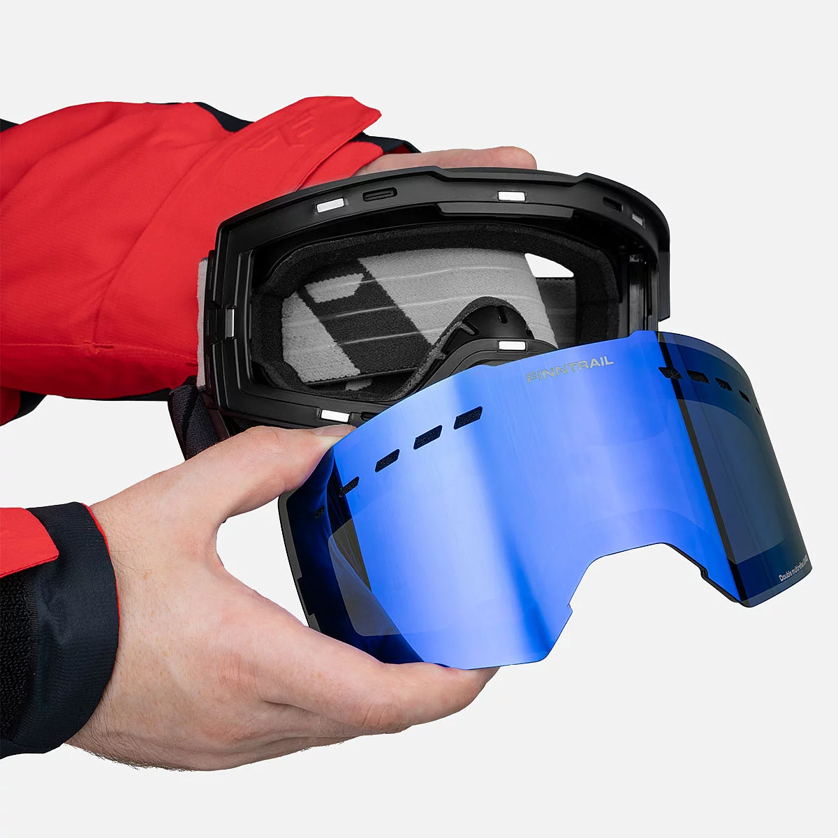 The main BlueMirrored lens (Cat.2, VLT 20.6%) is ideal for bright, sunny conditions, featuring a yellow inner lens tint and full anti-glare coating for optimal eye comfort. The magnetic lens system allows fast and easy swapping depending on light conditions. Both lenses are injection-molded for increased durability and scratch resistance, with Anti-Fog coating on the inner lens to prevent condensation.