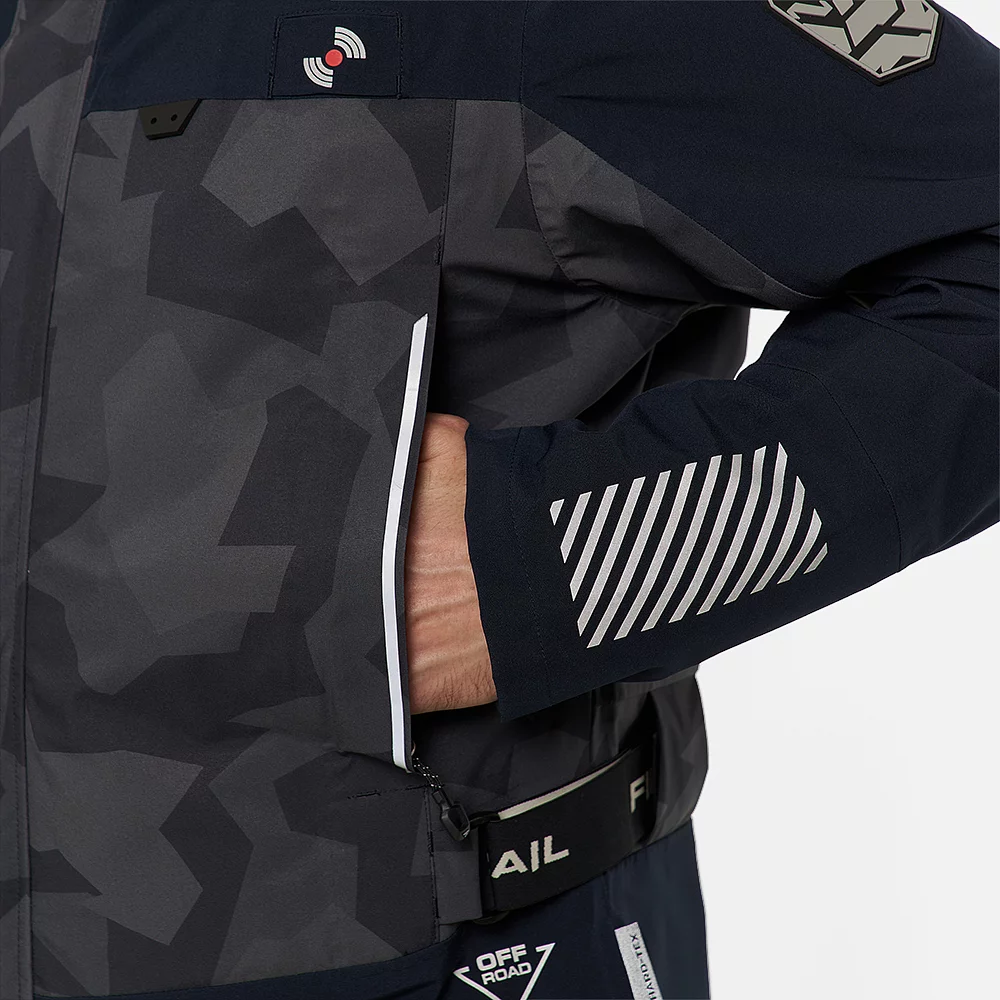 The Mudway jacket is equipped with reflective elements for enhanced visibility in low-light conditions. It includes additional D-rings for attaching a quad bike tether and an integrated belt made of sturdy rubber webbing for waist adjustment, with a wide belt loop on the back. All seams and zippers are hermetically sealed, ensuring complete waterproof protection.