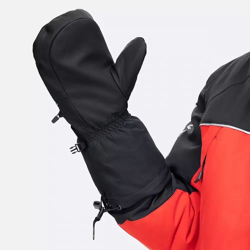 Thermalrate insulation and a soft fleece lining provide lasting warmth and comfort. A pocket on the back holds hand warmers, while reinforced palms and thumbs resist wear. Anatomical cut with elastic inserts ensures a comfortable fit, and the extended cuff with dual adjustment keeps out snow. An elastic safety loop secures the mittens to your wrist, and the inner cuff tightens automatically to retain heat.